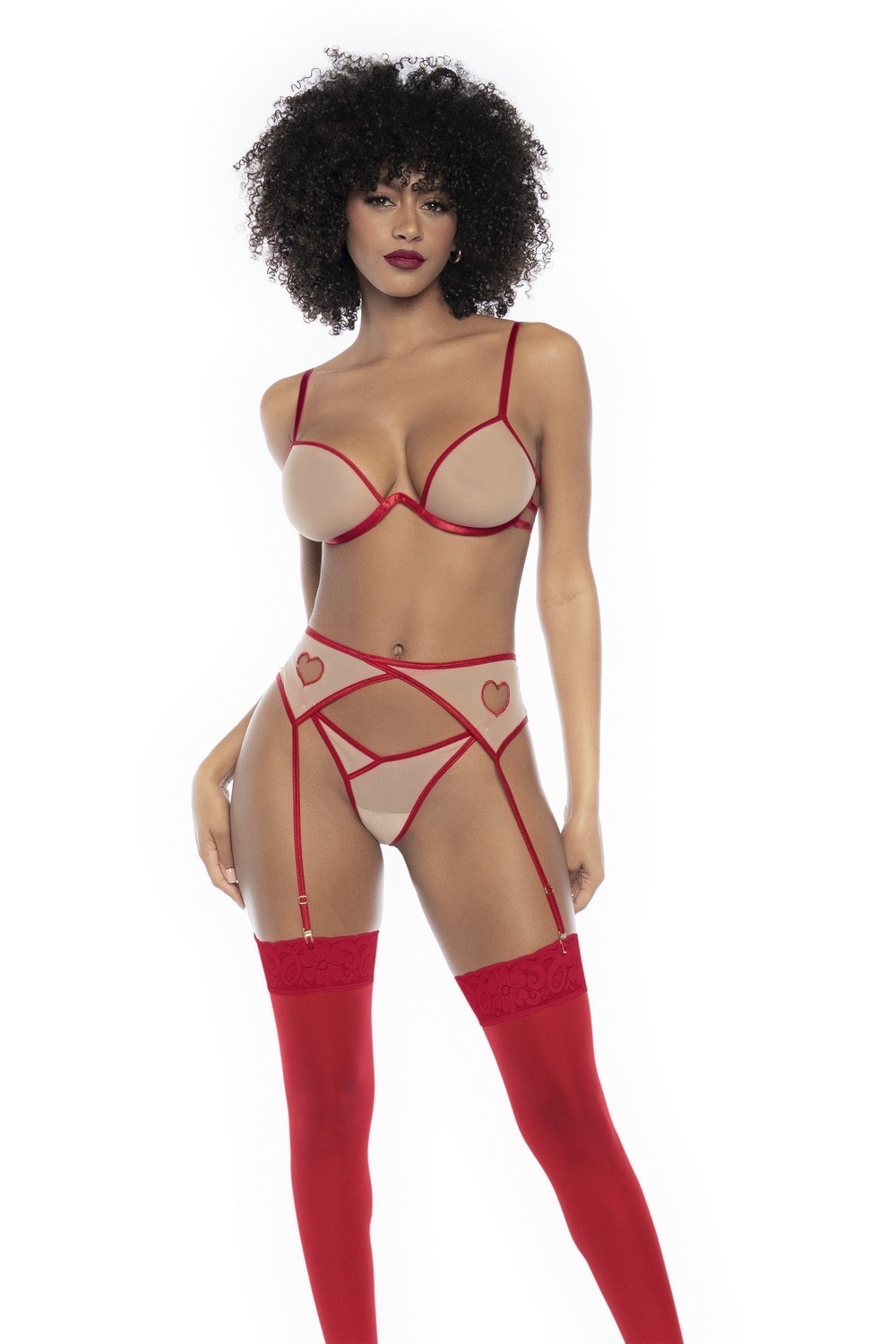 Comprenant un soutien-gorge avec armatures et bretelles réglables, porte-jarretelles avec un cœur brodé et string assorti.