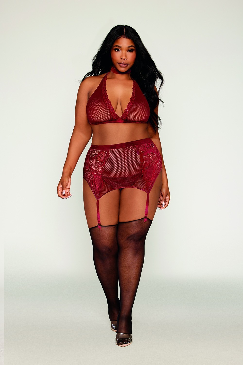 Ensemble 4 pièces rouge bordeau grande taille en résille et dentelle comprenant le tour de cou, le soutien gorge sans armatures, le string et le porte jarretelles. Bas non inclus