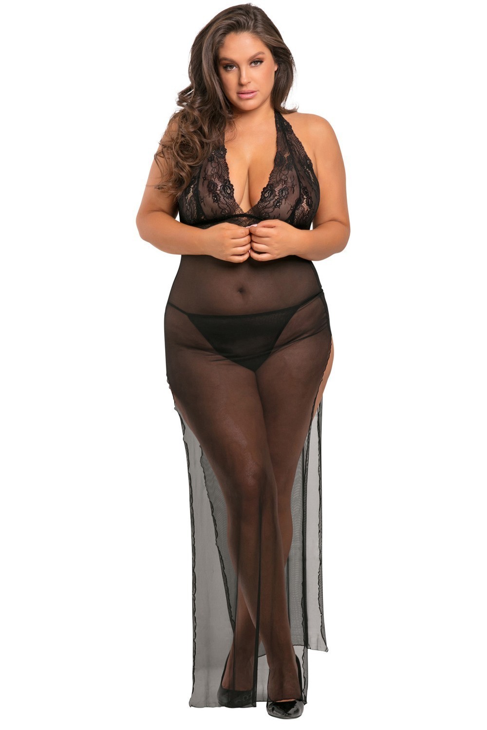 Une nuisette noire transparente pour femme ronde et bien fendue qui offre une vue imprenable sur le corps.